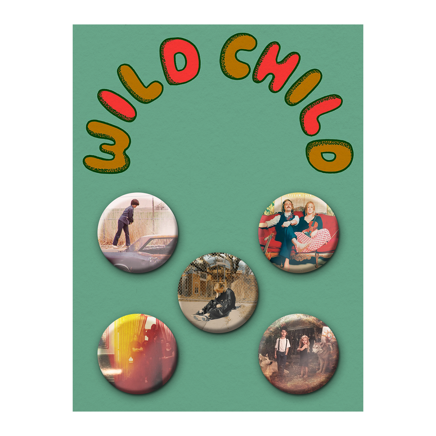 Set of five 25mm (1inch) pin badges featuring album artworks on backing card.